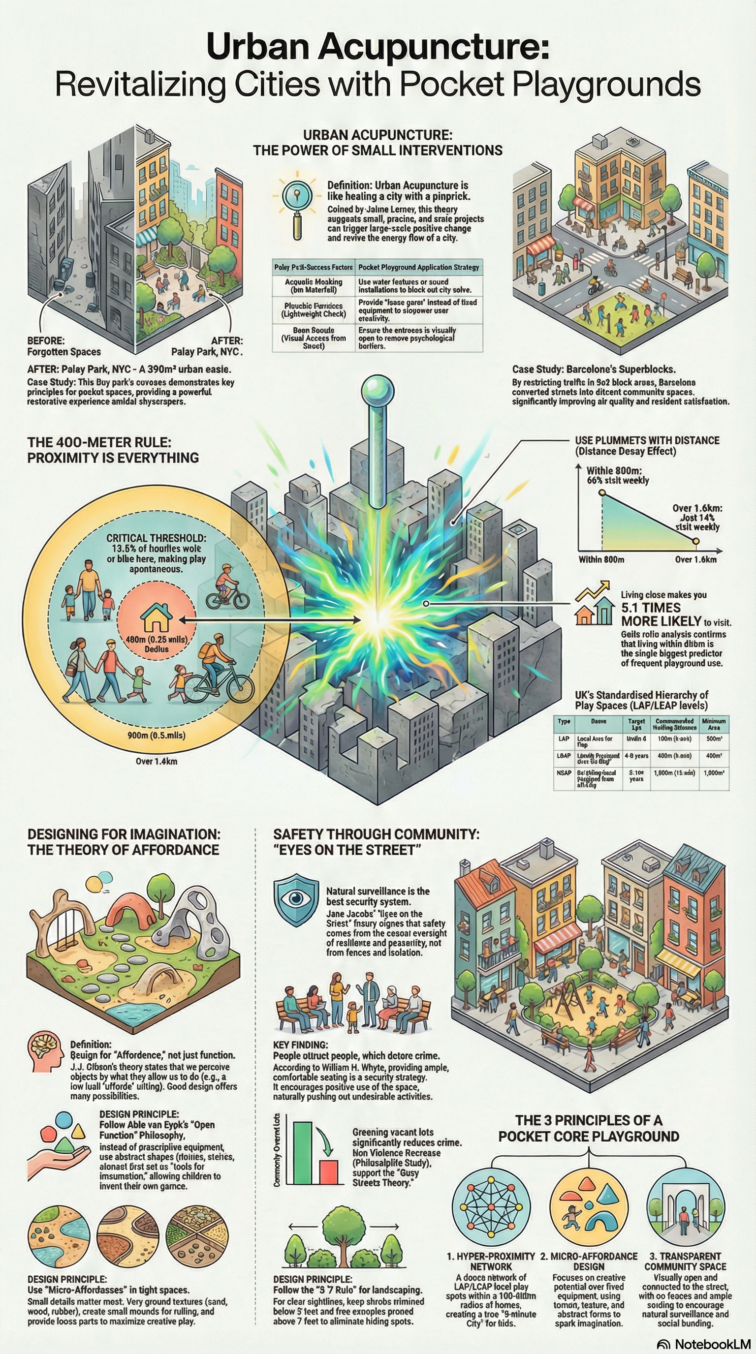 본 보고서는 포켓 코어 놀이터의 타당성과 필요성을 입증하기 위해 네 가지 핵심 이론적 축을 중심으로 심층적인 분석을 수행한다. 첫째, 하이메 레르네르(Jaime Lerner)의 '도시 침술(Urban Acupuncture)' 이론을 통해 소규모 개입이 가져오는 거시적 파급 효과를 고찰한다. 둘째, '15분 도시(15-minute City)' 모델과 아동 이동성(Child Mobility) 데이터를 기반으로 근거리 놀이 공간의 필수성을 정량적으로 증명한다. 셋째, 제임스 깁슨(J.J. Gibson)의 '행동 유도성(Affordance)' 이론과 알도 반 아이크(Aldo van Eyck)의 놀이터 디자인 철학을 접목하여 협소한 공간에서의 창의적 놀이 유도 메커니즘을 분석한다. 마지막으로, 제인 제이콥스(Jane Jacobs)와 윌리엄 H. 와이트(William H. Whyte)의 '자연적 감시(Natural Surveillance)' 이론 및 CPTED(범죄예방환경설계) 원칙을 통해 개방된 자투리 공간이 도시 안전망에 기여하는 바를 논증한다.