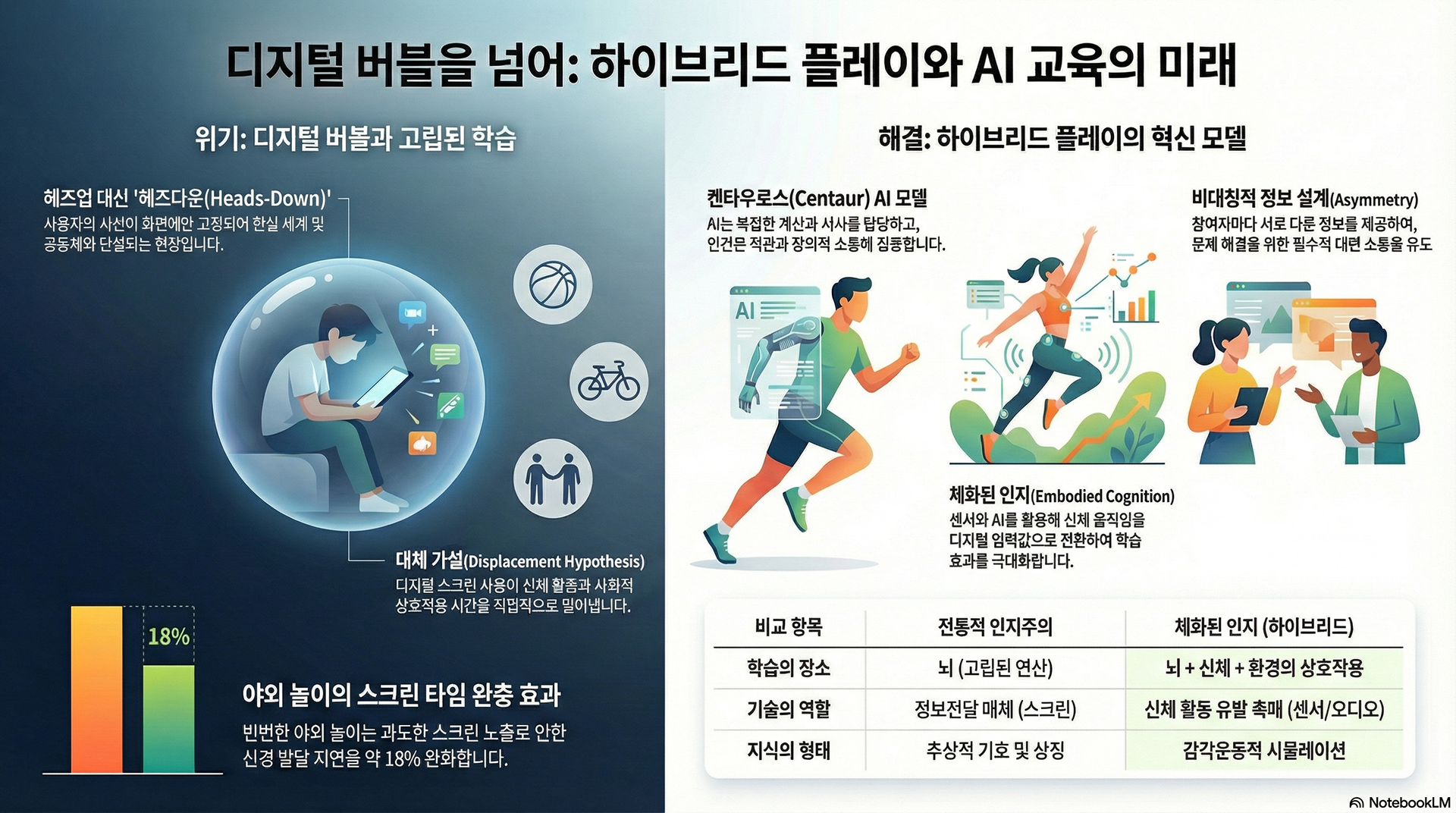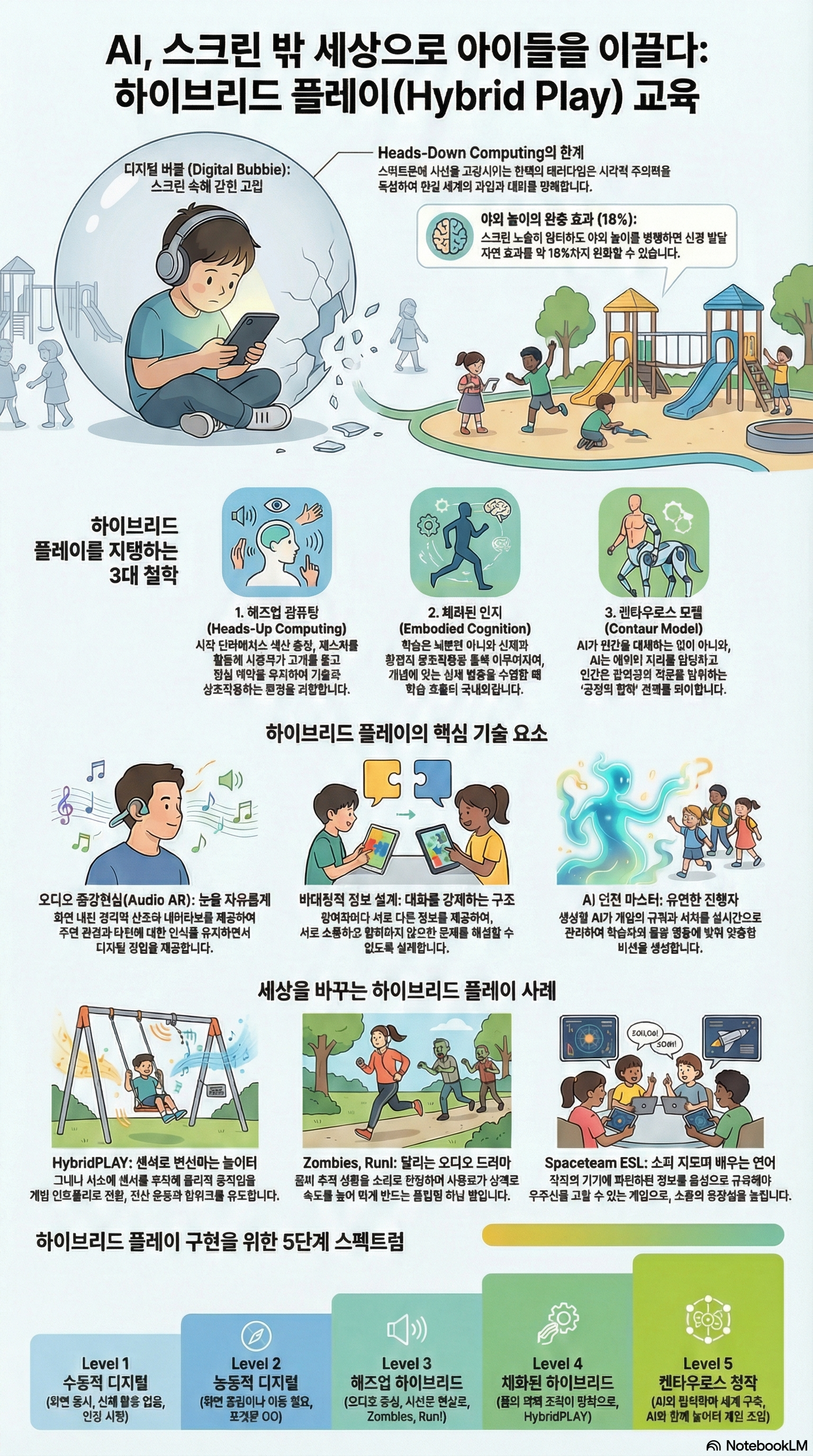 AI는 더 이상 학생들을 스크린 속에 가두는 감옥이 아니라, 그들을 넓은 운동장과 지역 사회로 내보내는 정교한 네비게이터이자 놀이의 촉진자가 되어야 한다. 이것이 바로 AI를 도구로 만드는 교육의 본질이며, 하이브리드 플레이가 지향해야 할 미래다.