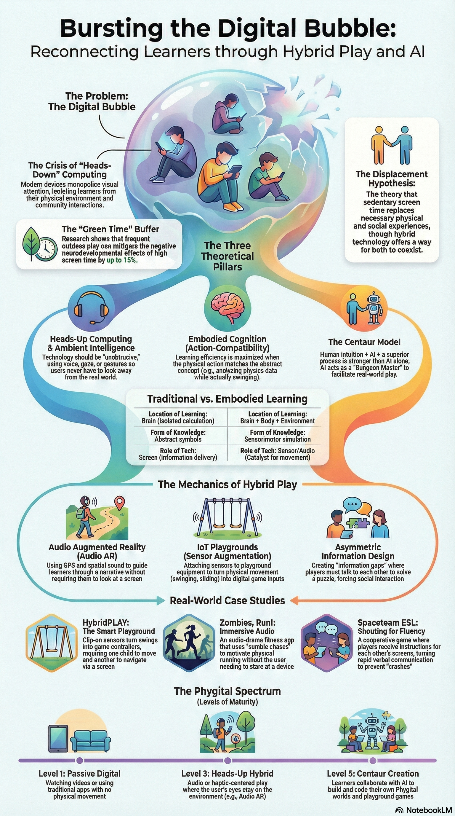 1. Heads-up Computing Homepage - Synteraction Lab, https://synteraction.org/heads-up-computing 2. Heads-Up Computing: Moving Beyond the Device-Centered Paradigm - ResearchGate, https://www.researchgate.net/publication/370633561_Heads-Up_Computing_Moving_Beyond_the_Device-Centered_Paradigm 3. Effective Generative AI: The Human- Algorithm Centaur - Faculty Research Working Paper Series - Harvard University, https://appext.hks.harvard.edu/publications/getFile.aspx?Id=5241 4. The centaur programmer -- How Kasparov's Advanced Chess spans over to the software development of the future - ResearchGate, https://www.researchgate.net/publication/370227010_The_centaur_programmer_--_How_Kasparov's_Advanced_Chess_spans_over_to_the_software_development_of_the_future 5. Ambient Computing: The Invisible Interface Revolution - Coderio, https://www.coderio.com/blog/innovation/ambient-computing-invisible-interface-revolutionizing-technology/ 6. Ambient computing and the sublimation of the user interface. | by David Jenkins - Medium, https://medium.com/illumination/ambient-computing-and-the-sublimation-of-the-user-interface-8caffbac3c8d 7. Physical Experiences Influence the Way We Think and Learn | Psychology Today, https://www.psychologytoday.com/us/blog/science-of-choice/202508/physical-experiences-influence-the-way-we-think-and-learn 8. Embodied Learning: Why at School the Mind Needs the Body - Frontiers, https://www.frontiersin.org/journals/psychology/articles/10.3389/fpsyg.2019.02098/full 9. Embodied cognition and STEM learning: overview of a topical collection in CR:PI - NIH, https://pmc.ncbi.nlm.nih.gov/articles/PMC5596025/ 10. A Study on the Effects of Embodied and Cognitive Interventions on Adolescents' Flow Experience and Cognitive Patterns - MDPI, https://www.mdpi.com/2076-328X/15/6/768 11. [PDF] The centaur programmer - How Kasparov's Advanced Chess spans over to the software development of the future | Semantic Scholar, https://www.semanticscholar.org/paper/The-centaur-programmer-How-Kasparov%27s-Advanced-over-Alves-Cipriano/2280a192eaf49c66cf539269e9b7958b6f412cfb 12. AI Dungeon Masters Procedural Storytelling in Tabletop Inspired Games, https://daydreamsoft.com/blog/ai-dungeon-masters-procedural-storytelling-in-tabletop-inspired-games 13. Outdoor Play as a Mitigating Factor in the Association Between Screen Time for Young Children and Neurodevelopmental Outcomes - PMC - NIH, https://pmc.ncbi.nlm.nih.gov/articles/PMC9871942/ 14. Research Digest: Screen time and green time | Children & Nature Network, https://www.childrenandnature.org/resources/research-digest-screen-time-and-green-time/ 15. Are children spending enough time playing outside or are screens taking over? - Digital Child, https://digitalchild.org.au/are-children-spending-enough-time-playing-outside-or-are-screens-taking-over/ 16. Deliverable 1 - Social Prescribing and the Digital Landscape - Greater London Authority, https://www.london.gov.uk/sites/default/files/socialprescribingdigital_landscapereport.pdf 17. The role of tech in social prescribing - Joy, https://www.thejoyapp.com/articles/the-role-of-tech-in-social-prescribing 18. Digitally enabled social prescriptions: adaptive interventions to promote health in children and young people - PMC - NIH, https://pmc.ncbi.nlm.nih.gov/articles/PMC7495656/ 19. The potentials of digital technology in social prescribing: a qualitative study of key stakeholders' perspectives - NIH, https://pmc.ncbi.nlm.nih.gov/articles/PMC12125895/ 20. Zombies, Run - Classroom Powerups - WordPress.com, https://gameinspireddesign.wordpress.com/2022/01/18/zombies-run/ 21. An Audio Game for Training Navigation Skills of Blind Children, https://sps.ewi.tudelft.nl/pubs/Audio%20Game_2015.pdf 22. Zombies, Run! - Wikipedia, https://en.wikipedia.org/wiki/Zombies,_Run! 23. HybridPLAY: A New Technology to Foster Outdoors Physical Activity, Verbal Communication and Teamwork - NIH, https://pmc.ncbi.nlm.nih.gov/articles/PMC4851100/ 24. (PDF) HybridPLAY: A New Technology to Foster Outdoors Physical Activity, Verbal Communication and Teamwork - ResearchGate, https://www.researchgate.net/publication/301638642_HybridPLAY_A_New_Technology_to_Foster_Outdoors_Physical_Activity_Verbal_Communication_and_Teamwork 25. Rolling the Dice: Imagining Generative AI as a Dungeons & Dragons Storytelling Companion - ResearchGate, https://www.researchgate.net/publication/369792636_Rolling_the_Dice_Imagining_Generative_AI_as_a_Dungeons_Dragons_Storytelling_Companion 26. ChatGPT as an Assistant Dungeon Master - Geek Philosophy, https://geek-philosophy.com/chatgpt-as-an-assistant-dungeon-master-2 27. A Best-Fit Framework and Systematic Review of Asymmetric Gameplay in Multiplayer Virtual Reality Games - Frontiers, https://www.frontiersin.org/journals/virtual-reality/articles/10.3389/frvir.2021.694660/full 28. Information Asymmetry: The Informed Minority Advantage - Doctor Spin, https://doctorspin.net/information-asymmetry/ 29. Exploring the Effects of Different Asymmetric Game Designs on User Experience in Collaborative Virtual Reality - arXiv, https://arxiv.org/html/2510.14607v1 30. An Asymmetric Multiplayer Learning Environment for Room-Scale Virtual Reality and a Handheld Device - Graz University of Technology, https://tugraz.elsevierpure.com/ws/portalfiles/portal/72637658/3604244.pdf 31. Hybrid Play - How it works - YouTube, https://www.youtube.com/watch?v=SWs6EU-QpYs 32. Hybrid Play: Frontpage, http://www.hybridplay.com/ 33. Get started with Zombies, Run!, https://zrx.app/news/Get-started-with-zr 34. Set super-chicken to 3! Student and teacher perceptions of Spaceteam ESL - ERIC, https://files.eric.ed.gov/fulltext/ED564194.pdf 35. Shouting in the Kenyan Space: Can Spaceteam ESL Improve L2 Learners' Oral Reading - ERIC, https://files.eric.ed.gov/fulltext/EJ1336645.pdf 36. DMDAN the chatgpt DungeonMaster and teacher of all things D&D : r/DMAcademy - Reddit, https://www.reddit.com/r/DMAcademy/comments/11u68k6/dmdan_the_chatgpt_dungeonmaster_a
