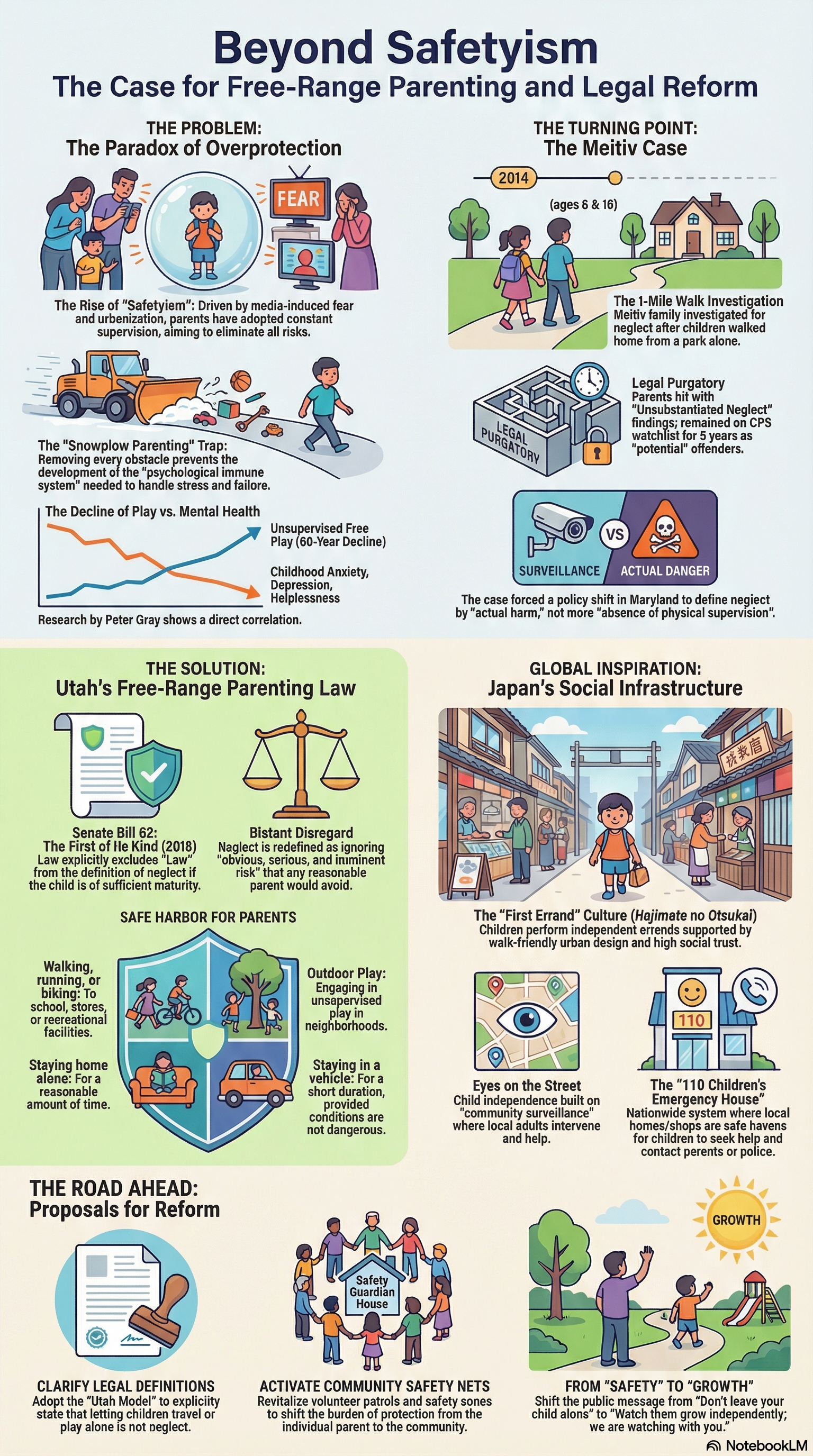 메이티브 사건은 선의에 의한 안전주의가 어떻게 국가 권력의 남용으로 이어질 수 있는지를 경고했으며, 유타주의 방목형 육아법은 이에 대한 민주적이고 합리적인 해결책을 제시했다. 피터 그레이와 조나단 하이트의 연구는 이러한 법적 변화가 단순히 부모의 권리를 넘어, 아동의 정신건강과 미래 세대의 회복탄력성을 위해 필수적임을 과학적으로 증명한다.