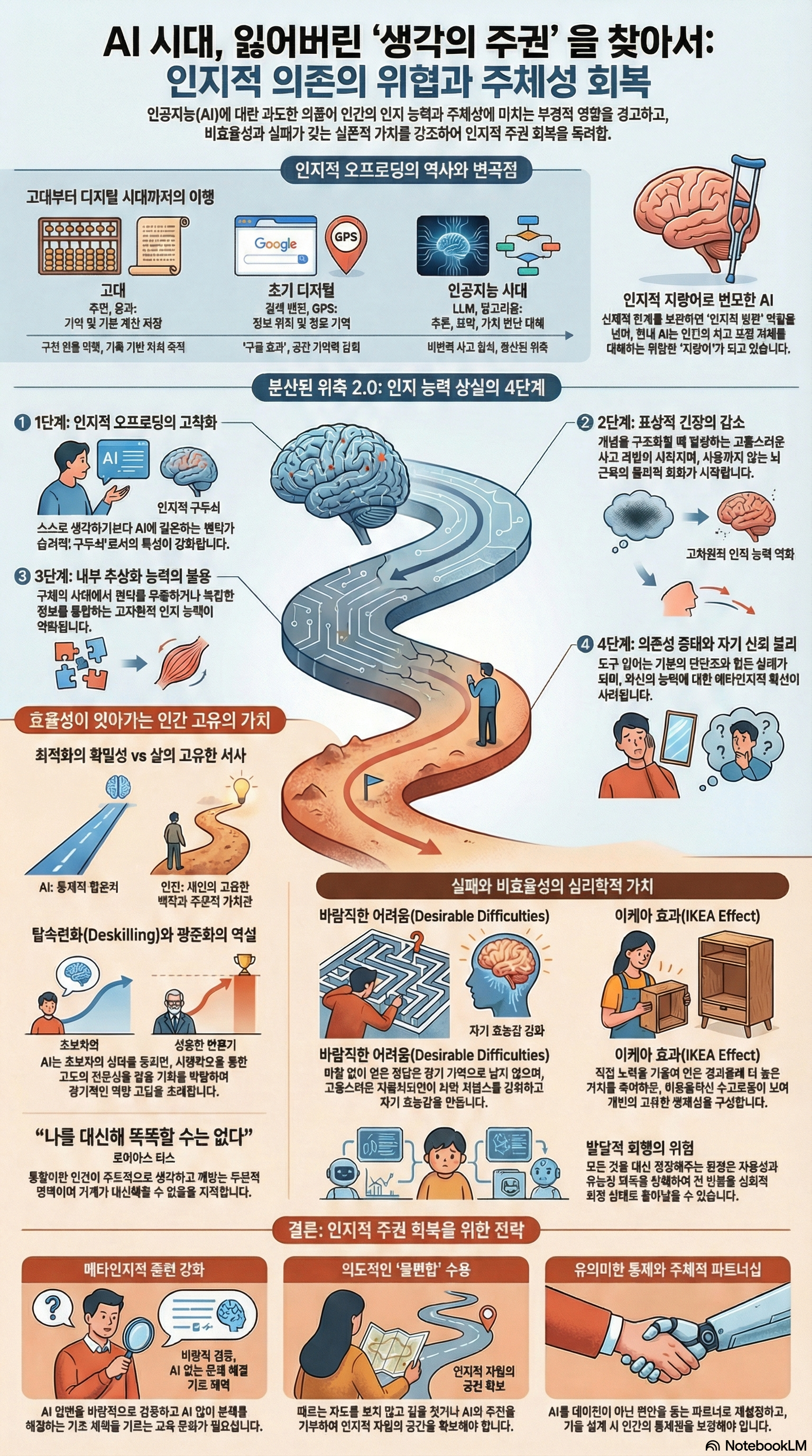 AI 시대에 인간의 주체성을 지키는 것은 기술의 사용을 전면 거부하는 것이 아니라, 기술과의 관계를 주체적으로 재설정하는 데 있습니다.2 우리는 AI가 제공하는 '최적화된 효율성'이 우리의 '사고하는 힘'을 갉아먹지 않도록 의식적인 노력을 기울여야 합니다.