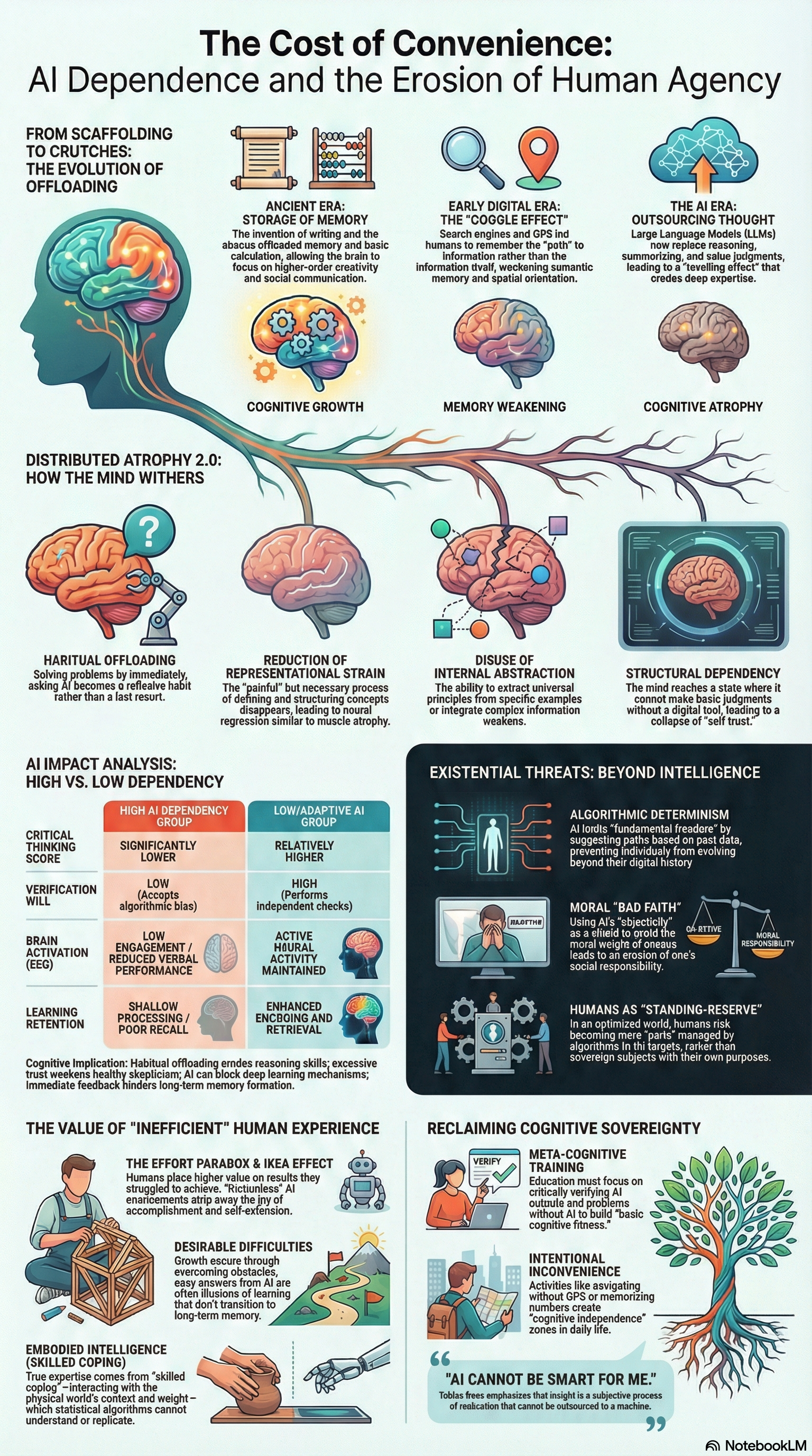 첫째, 교육 현장에서는 AI의 답변을 비판적으로 검증하고, AI 없이도 문제를 해결할 수 있는 기초 체력을 기르는 '메타인지적 훈련'이 강화되어야 합니다.2 실패할 권리와 비효율적인 탐구의 가치를 존중하는 교육 문화가 정착되어야 합니다.27 둘째, 일상생활에서 모든 판단을 알고리즘에 맡기지 않는 '인지적 자립'의 공간을 확보해야 합니다.3 때로는 지도를 보지 않고 길을 찾고, 전화번호를 외우며, AI의 추천을 거부하고 낯선 선택을 하는 '불편함'을 의도적으로 수용해야 합니다.2