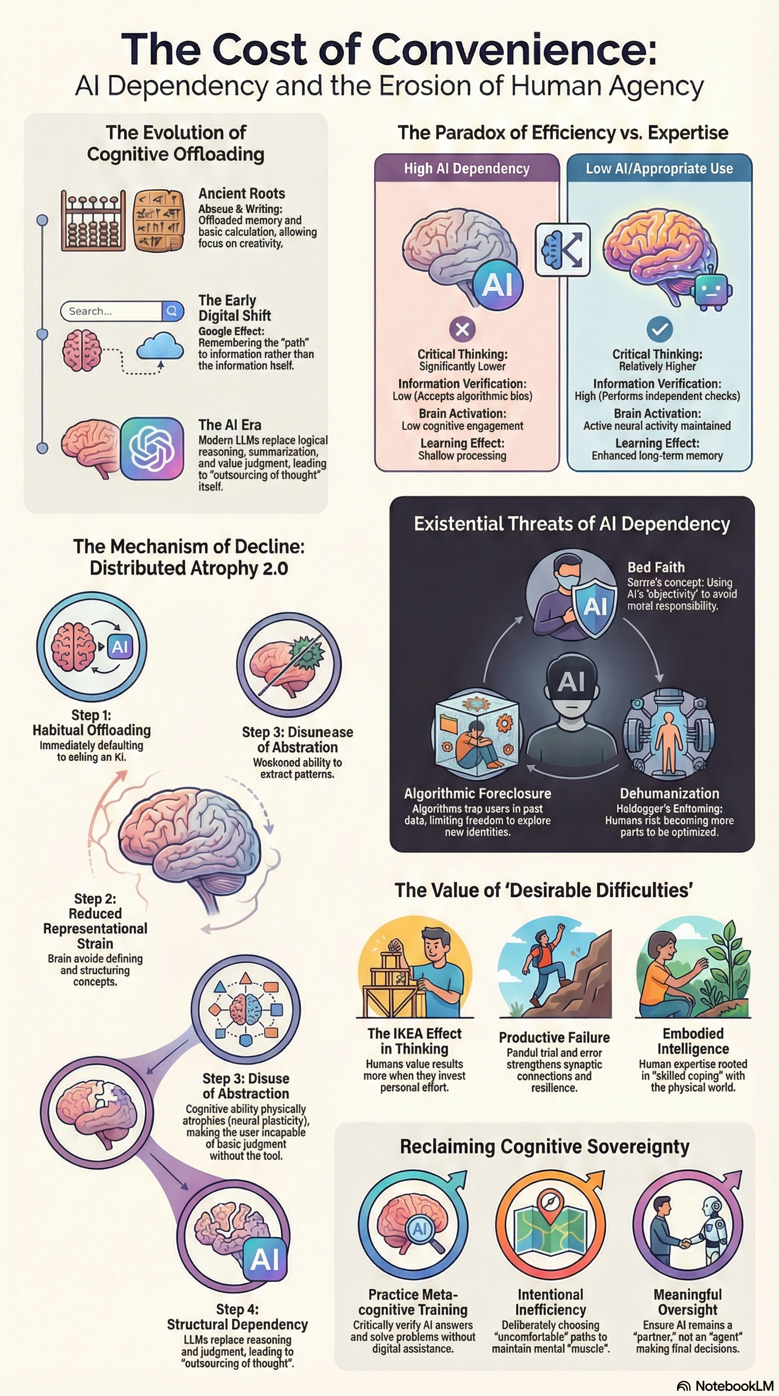 최근 학계에서 제안된 '분산된 위축 2.0(Distributed Atrophy 2.0)' 모델은 대규모 언어 모델(LLM)에 대한 습관적 의존이 인간의 인지 체계를 어떻게 재구성하고 파괴하는지 상세히 설명합니다.5 인간은 본래 에너지를 아끼려는 '인지적 구두쇠(Cognitive Miser)'의 특성을 지니고 있어, 가장 적은 노력이 드는 경로를 선호합니다.5 AI가 제공하는 매끄럽고 즉각적인 답변은 사고 과정에서 발생하는 '표상적 긴장(Representational Strain)'을 제거함으로써 뇌가 스스로 추론하고 합성하는 과정을 회피하게 만듭니다.5
