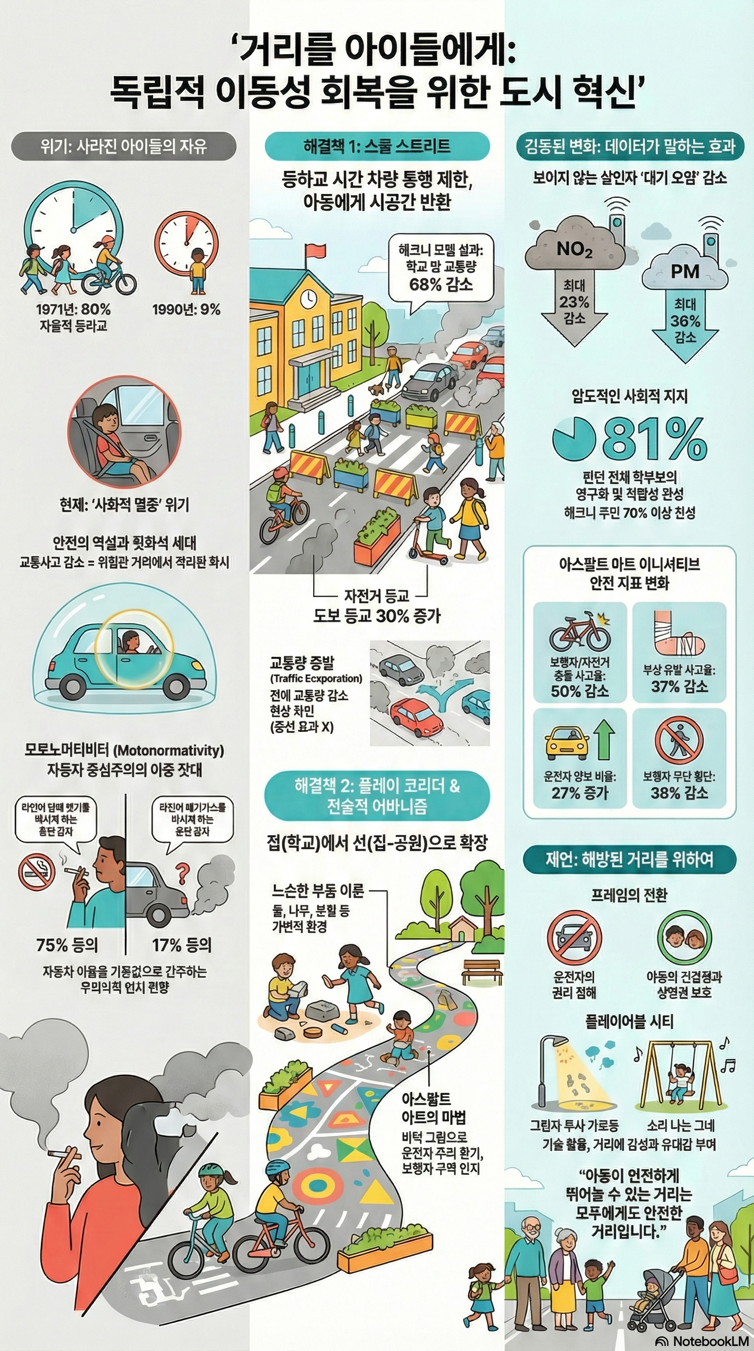 더 놀라운 것은 보이지 않는 살인자, 대기오염의 감소다. 이산화질소($NO_2$) 농도가 23%나 줄어들면서, 아이들은 비로소 깨끗한 공기를 마시며 걸을 권리를 되찾았다.
