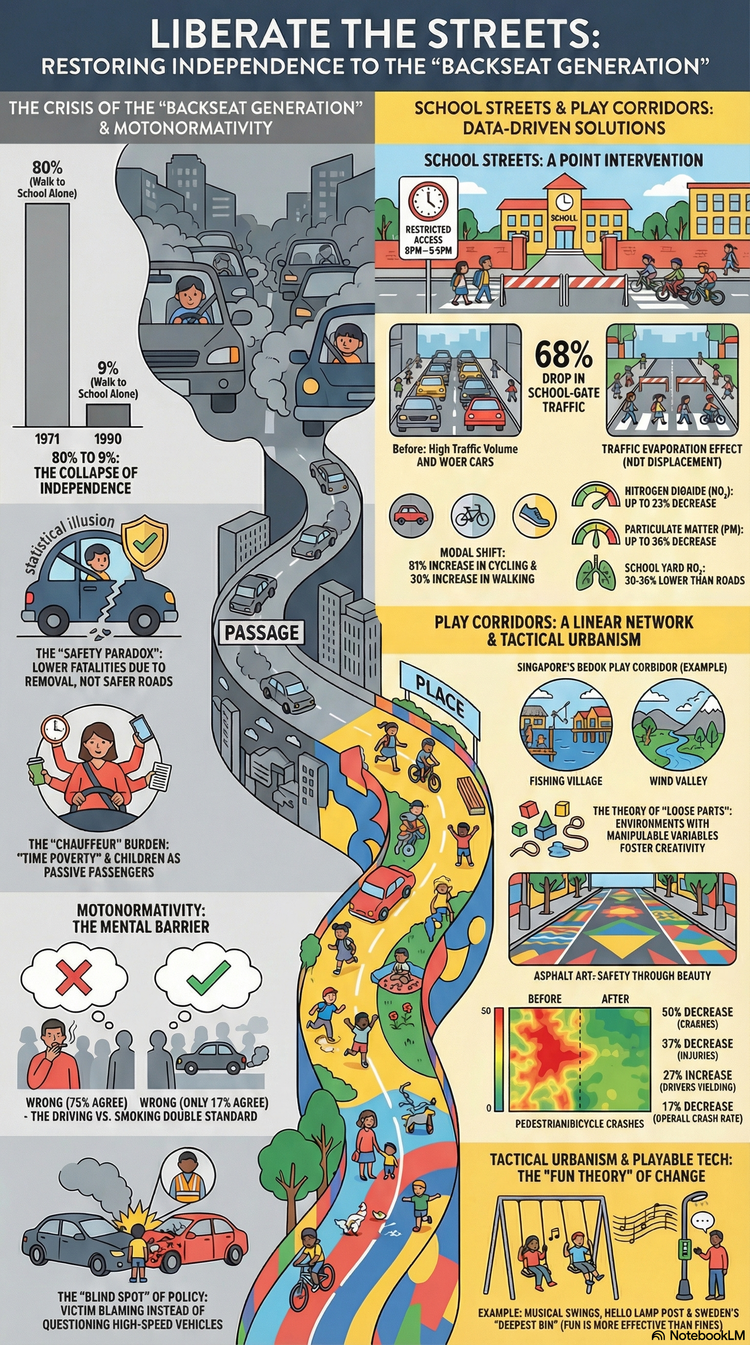 Streets were once sites of socialization and adventure, but they have now become forbidden zones. This report asserts that restoring children's "Independent Mobility" is not just about traffic safety; it is a matter of public health and social equity. The emergence of the "Backseat Generation"—children deprived of the right to walk or play independently—has led to severe social costs, including obesity and declining mental health. To address this, we focus on two strategies: "School Streets" (liberating school zones from cars) and "Play Corridors" (reconfiguring daily routes into play networks).
