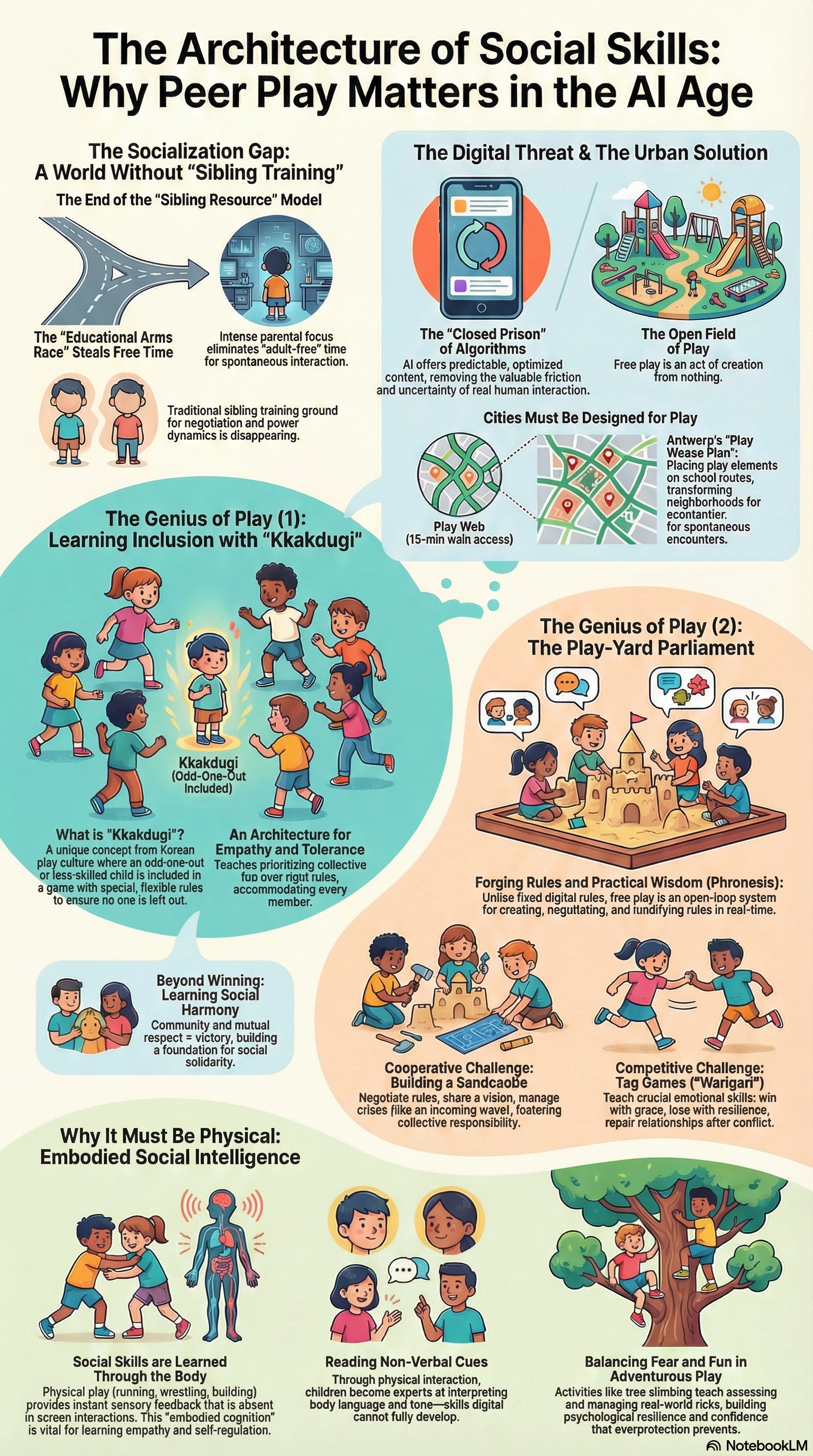 이러한 공백을 메울 수 있는 유일하고도 강력한 대안은 어른의 개입이 배제된 '또래와의 자유 놀이'이다. 자유 놀이는 단순한 유희의 차원을 넘어, 아동이 스스로 규칙을 설계하고 이해관계를 조정하며 공동의 책임을 완수하는 '사회적 협상의 아키텍처'를 구축하는 실전적 과정이다.5 인공지능(AI)과 디지털 알고리즘이 아동의 일상을 잠식하는 시대에, 놀이를 통해 체득되는 인간적 상호작용과 관계 판단 능력은 기계가 결코 대체할 수 없는 인간 고유의 영역으로 남는다.7 본 보고서는 또래 놀이가 가르치는 사회적 기술의 메커니즘을 심층 분석하고, 현대 사회에서 이러한 기술이 모든 곳에서 학습될 수 있도록 보장하는 도시 공학적·교육적 설계 방안을 고찰한다.