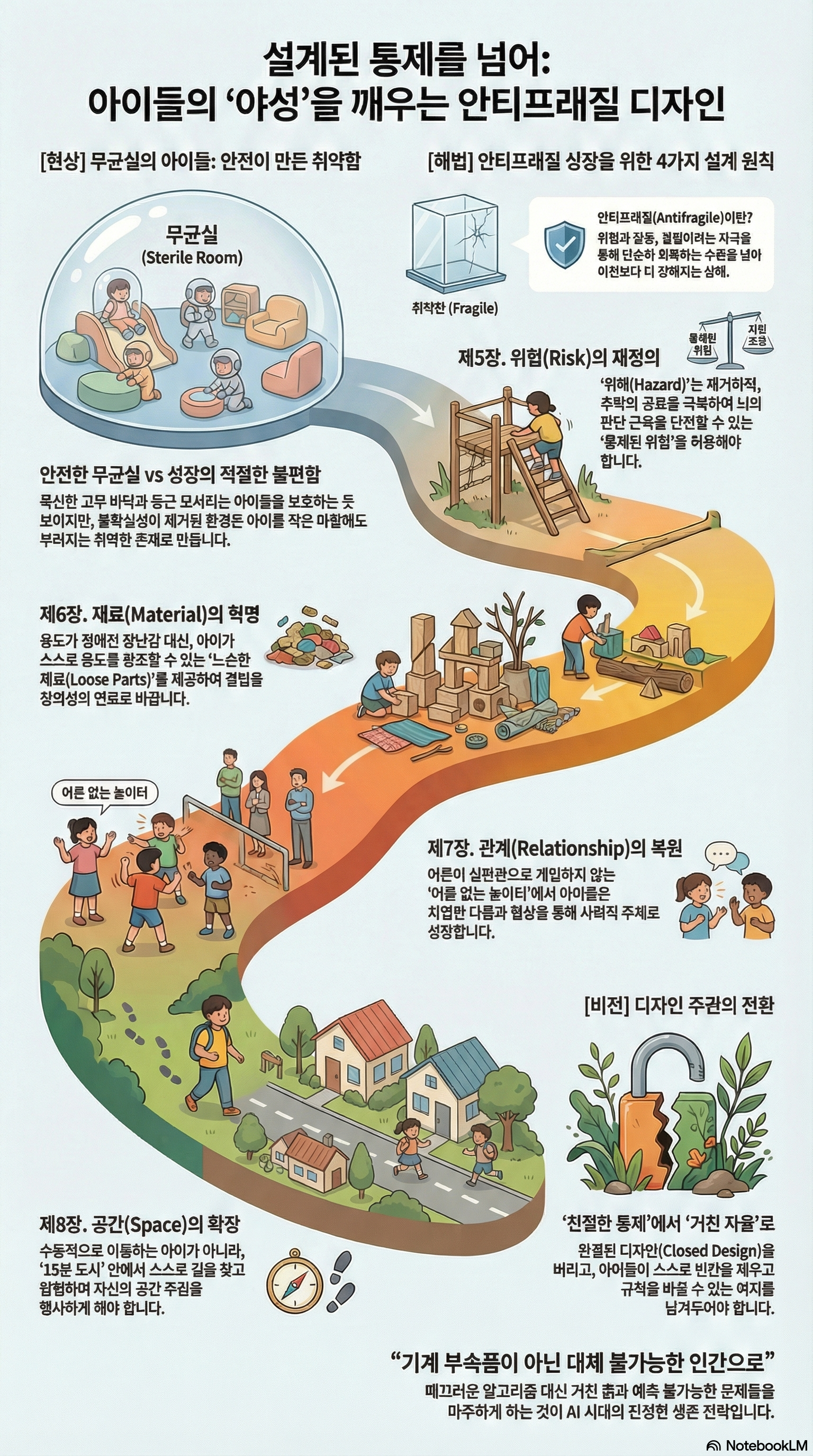 무균실에서 자란 아이는 작은 먼지에도 알레르기 반응을 일으킨다. 마찬가지로, 위험과 갈등, 불확실성이 제거된 환경에서 자란 아이는 세상의 작은 마찰 앞에서도 쉽게 부러지는 '취약한(Fragile)' 존재가 된다. 우리가 설계해야 할 것은 편안함이 아니라, 성장을 자극하는 **'적절한 불편함'**이다.