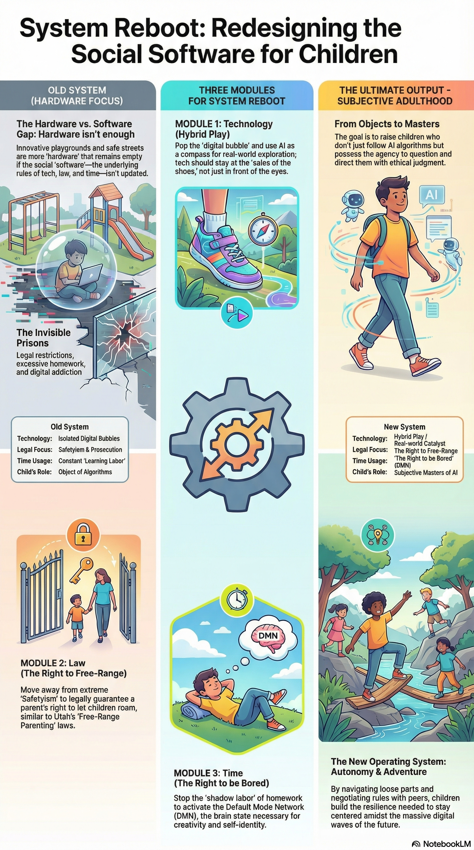 Only children who have created with loose parts, negotiated rules with friends, and verified reality with their own two feet will not lose their center amidst this massive digital wave. Now is the time to Reboot the system. Let us erase the oppressive codes of safety and efficiency, and install a new operating system of "Autonomy" and "Adventure" in their place.