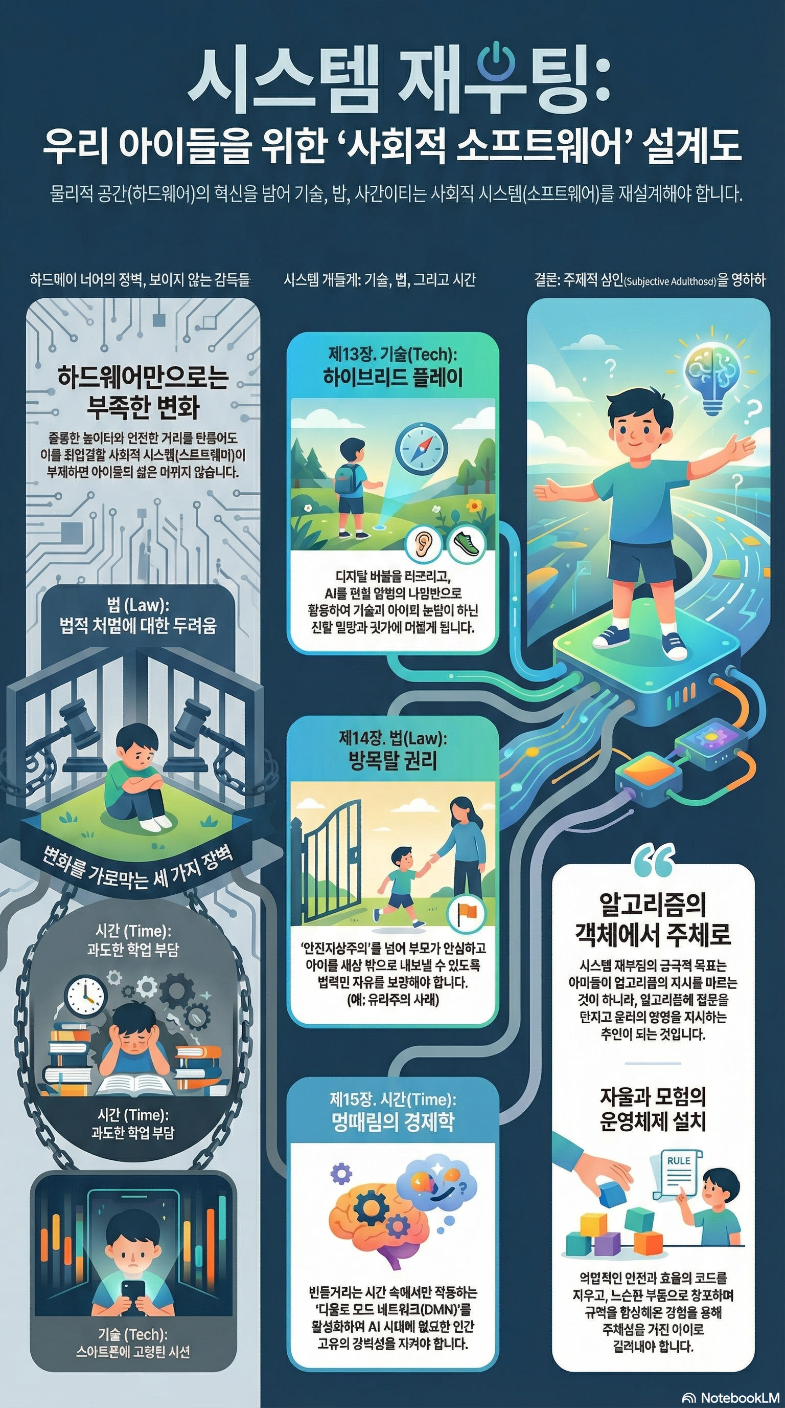 앞선 2부와 3부에서 우리는 아이들을 위한 물리적 공간—놀이터, 거리, 도시—을 어떻게 혁신할 것인지 논했다. 그러나 아무리 훌륭한 '하드웨어'를 구축한다 해도, 그것을 작동시키는 사회적 '소프트웨어'가 바뀌지 않는다면 변화는 요원하다.